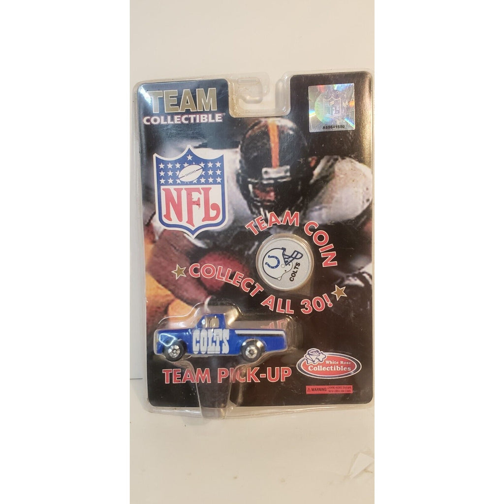The product is a 1999 White Rose Team Collectible Indianapolis Colts Team Coin/Pick-up. It is a collectible item featuring the NFL team, the Indianapolis Colts. The item also includes a team coin, designed to commemorate the 1999 season of the Colts. This collectible is perfect for fans of the Indianapolis Colts looking to add unique memorabilia to their collection.