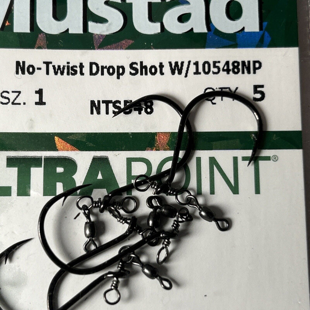 The product is a pack of 5 Mustad No Twist Drop Shot Hooks with model number 10548NP, in size 1. These black bait hooks are designed for freshwater fishing and are suitable for all freshwater fish species. They feature a dropshot design to enhance fishing effectiveness. Ideal for anglers looking for high-quality hooks for their fishing tackle collection.