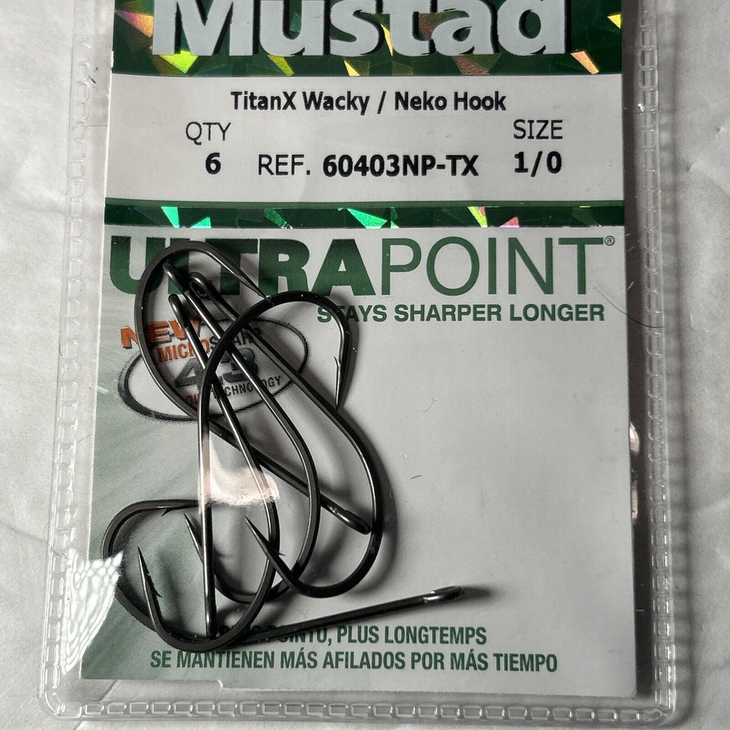 The product is a pack of 6 Mustad TitanX Bait Hooks designed for wacky or neko rigging techniques in freshwater fishing. These size 1/0 black hooks are suitable for catching all types of freshwater fish. The Mustad brand is known for producing high-quality fishing hooks, and the 60403NP-TX model offers durability and strength for successful fishing outings.