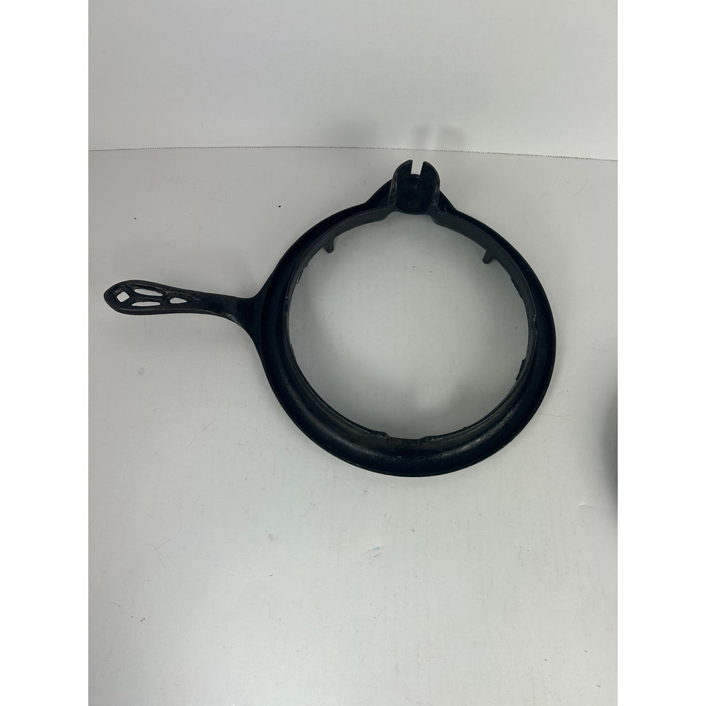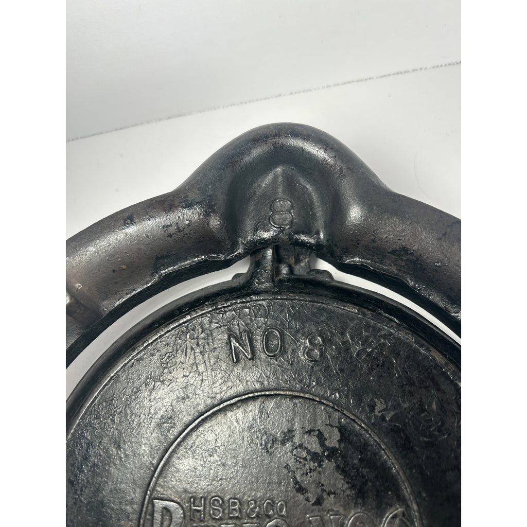 This antique cast iron waffle iron is the Rey-O-Noc No. 8, produced by HS B & Co during the early Griswold era. It features deep waffle grids, a hinged design, and original long handles with coiled grips. Marked with patent date July 1, 1902, this piece represents classic early American cast iron cookware.