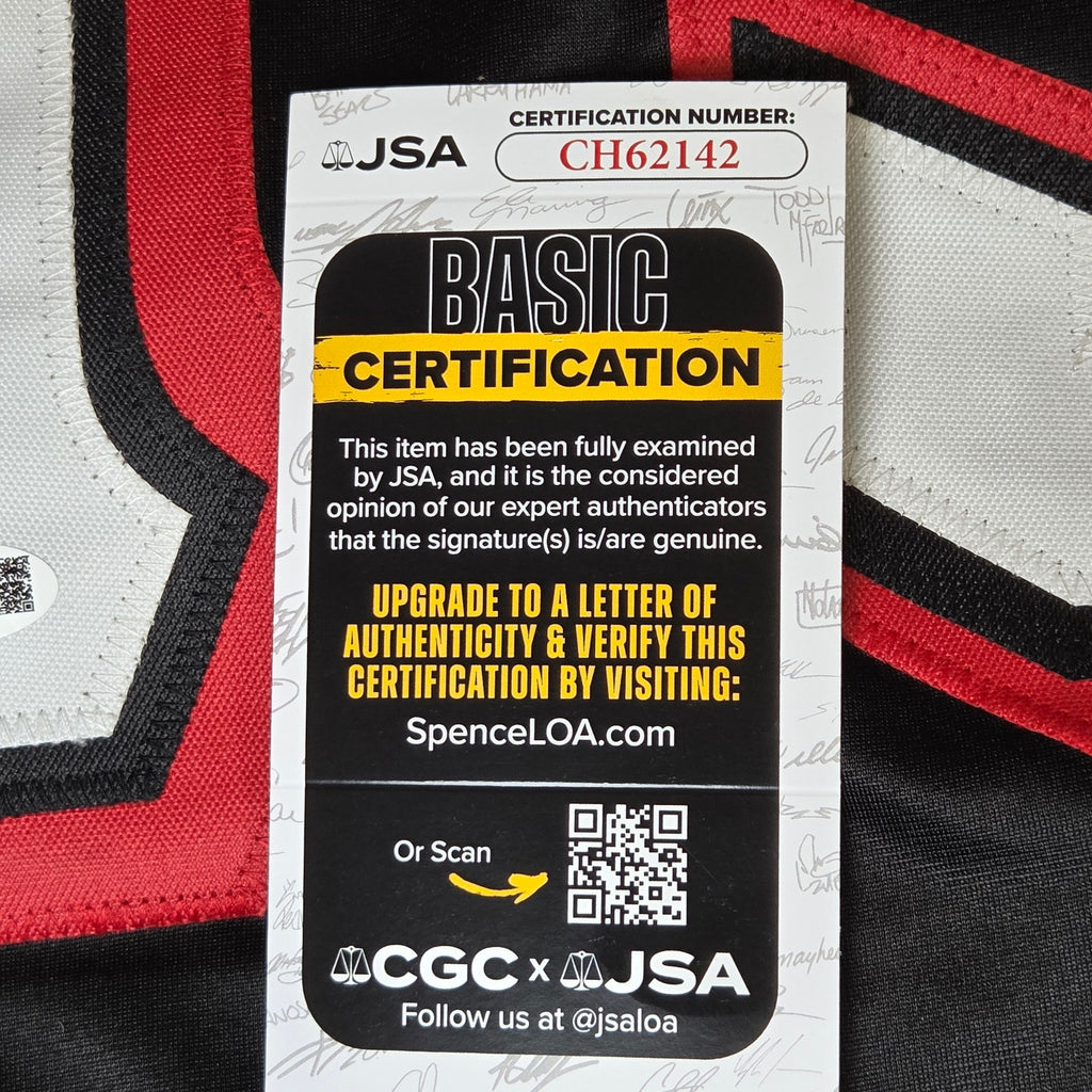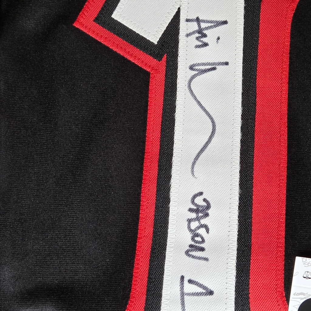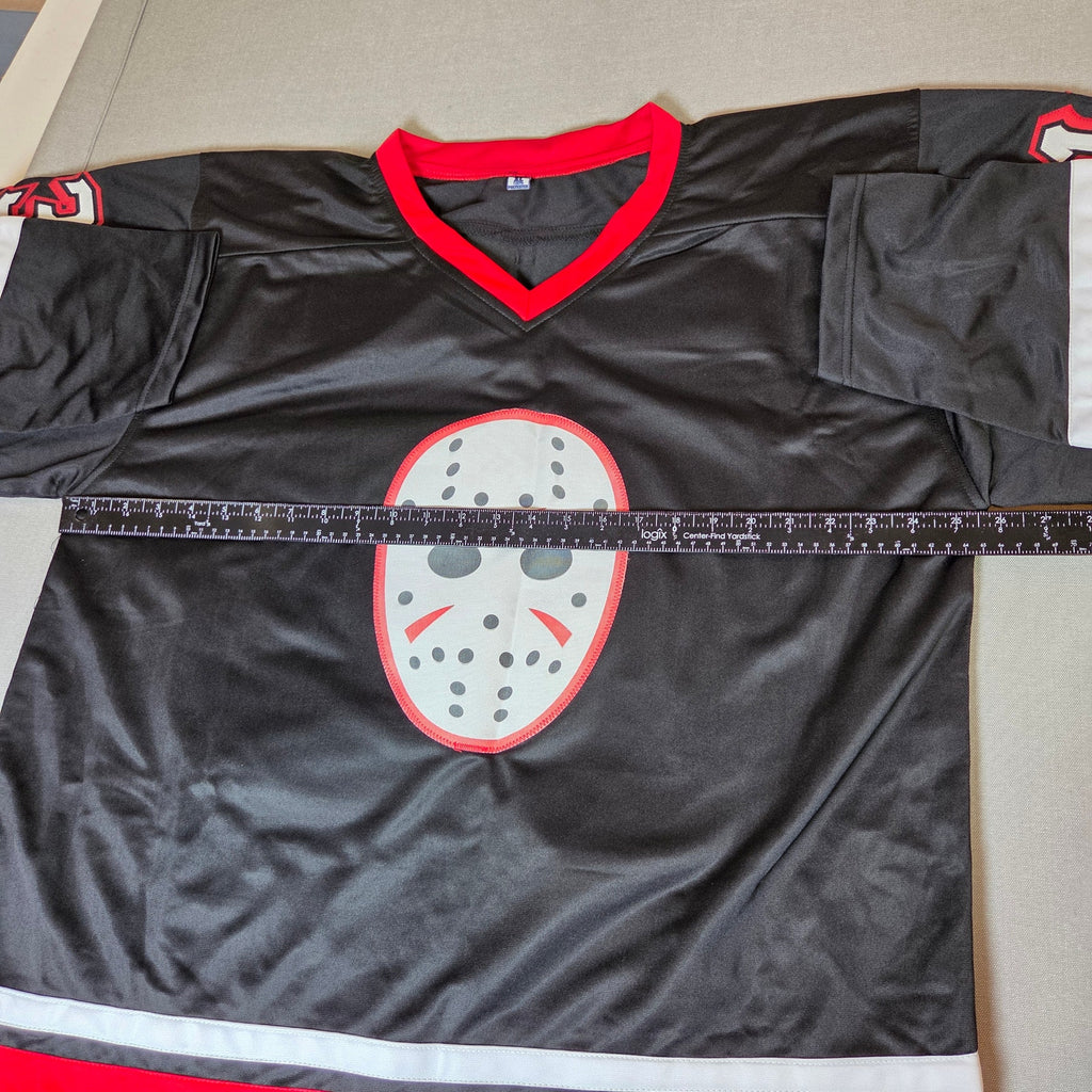 This custom black-and-red Jason Voorhees #13 hockey jersey has been hand-signed by Ari Lehman, the actor who played Jason Voorhees (Jason 1) in the original Friday the 13th. The signature is crisp, placed on the sewn “1,” and verified by JSA with matching certification sticker and card. A bold piece for horror collectors, jersey displays, or autograph collections.