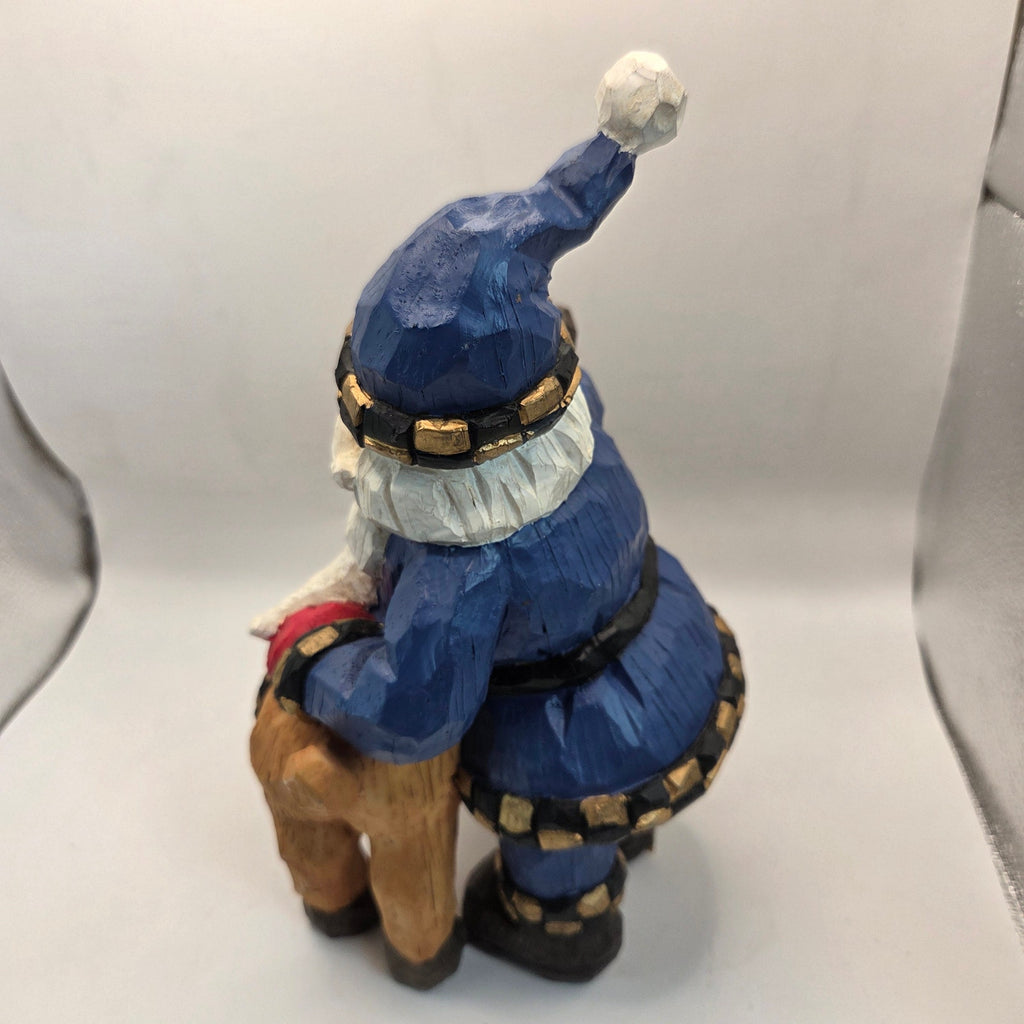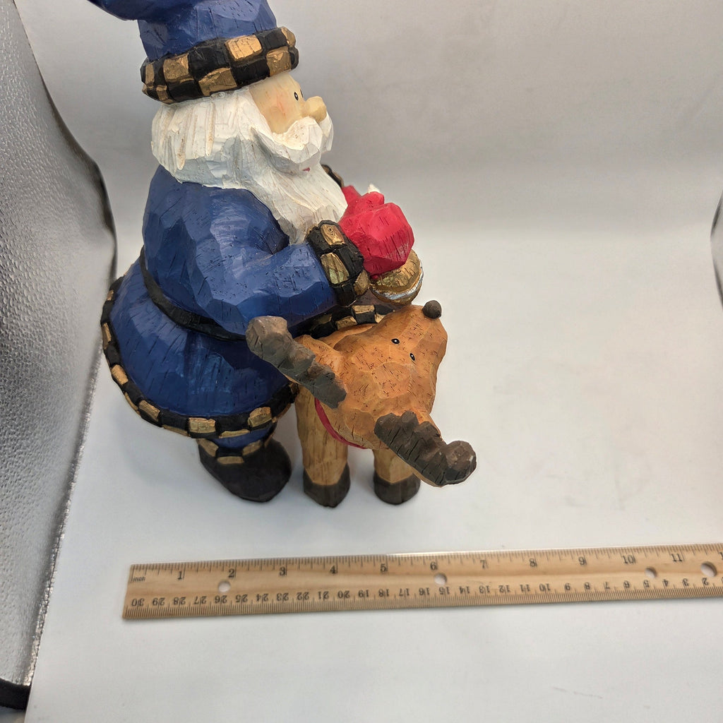 Charming resin Christmas figurine featuring Santa in a blue coat riding a reindeer. Piece has a hand-carved style texture with gold accents and bright festive colors. Stands just under 11 inches tall and weighs just over 2 pounds, giving it a sturdy and substantial feel. Excellent for shelf, entryway, or holiday display. Overall very good condition with only minimal paint wear as shown.