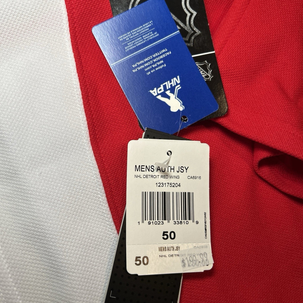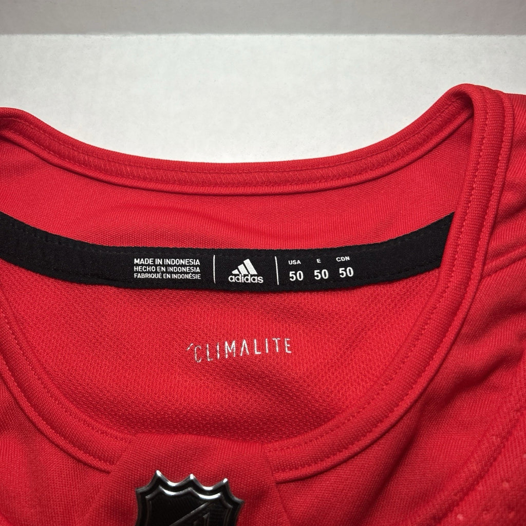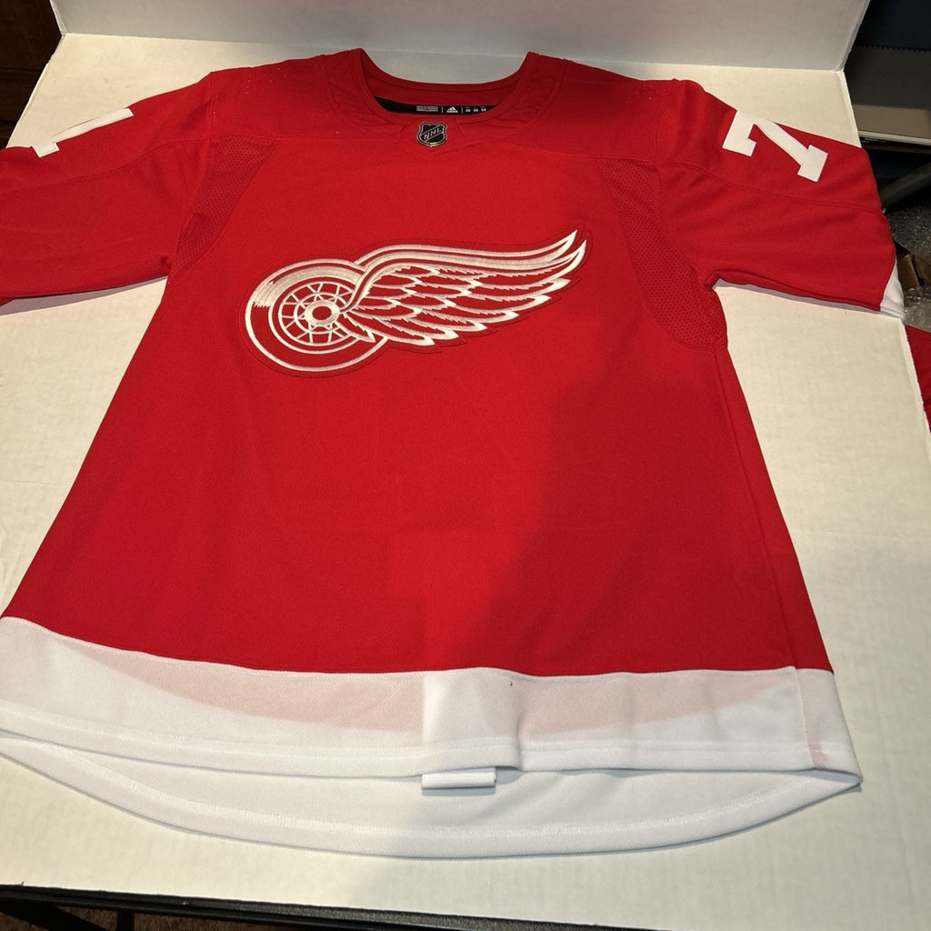 The product is a men's size 50 Dylan Larkin #71 Detroit Red Wings Adidas Climalite NHL jersey. This officially licensed jersey features the player's name and number, representing the Detroit Red Wings in the National Hockey League (NHL). The jersey is in the iconic team color of red, making it a perfect choice for fan apparel and souvenirs. With the Adidas brand logo, this jersey is both stylish and high-quality, perfect for any hockey enthusiast looking to show their team pride.