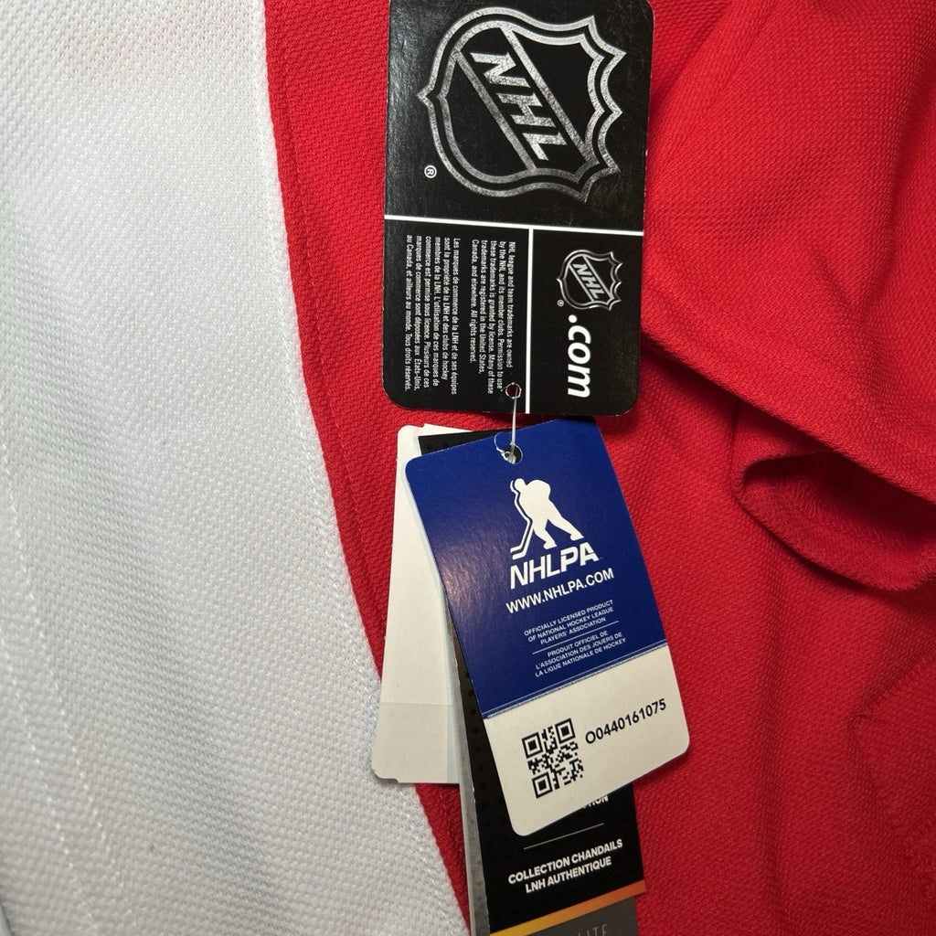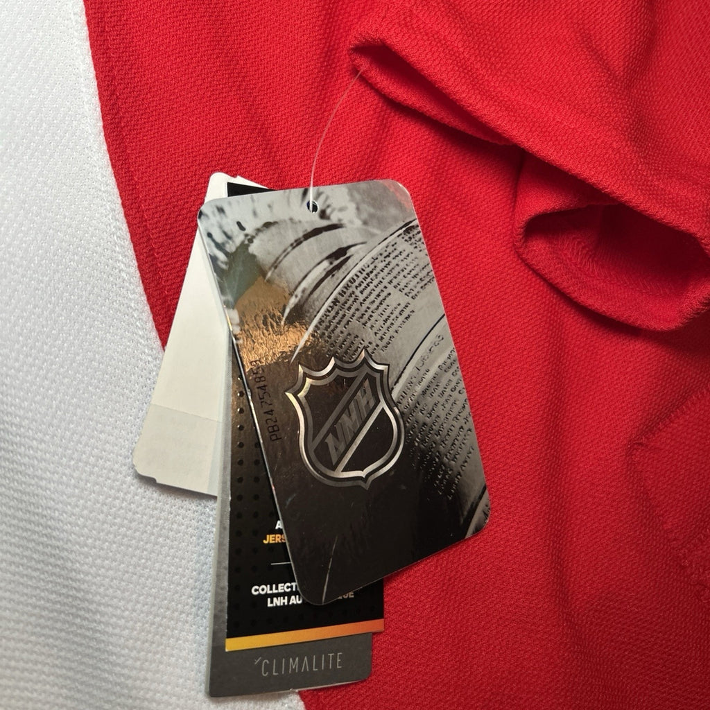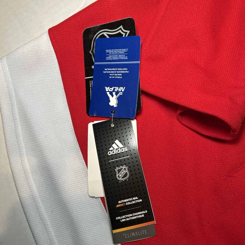 The product is a men's size 50 Dylan Larkin #71 Detroit Red Wings Adidas Climalite NHL jersey. This officially licensed jersey features the player's name and number, representing the Detroit Red Wings in the National Hockey League (NHL). The jersey is in the iconic team color of red, making it a perfect choice for fan apparel and souvenirs. With the Adidas brand logo, this jersey is both stylish and high-quality, perfect for any hockey enthusiast looking to show their team pride.