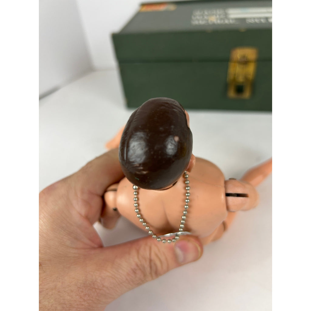 This complete vintage 1970s G.I. Joe Sea Rescue lot is a standout for collectors, featuring the original figure in sea-rescue uniform, full gear, inflatable yellow raft, paddles, life-vest, fins, manual, and the military-style green wooden footlocker case with tray for storage. All items are from the Adventure Team/Hasbro era and show authentic age wear consistent with use and display.
