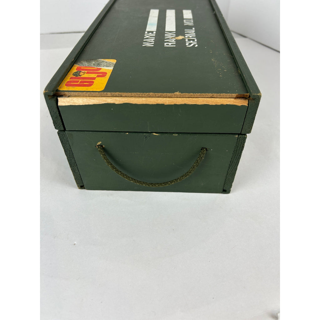 • Original green wooden footlocker case with hinged lid and carry handle, marked “Name / Rank / Serial No.” stencil on top