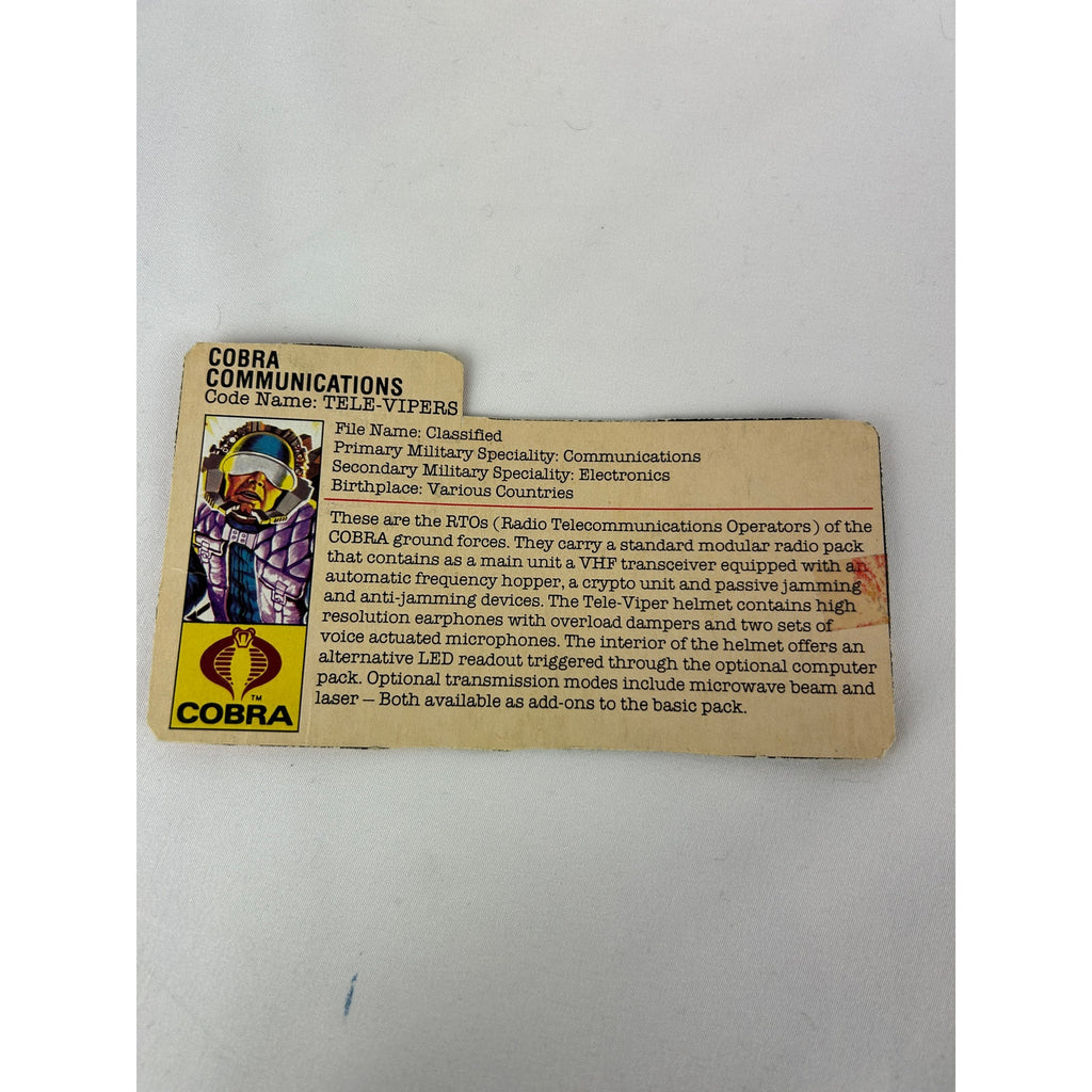 Original GI Joe Cobra Tele-Viper Communications action figure from the mid-1980s, sold complete with accessories and original file card. A core Cobra support trooper responsible for battlefield communications and electronics.