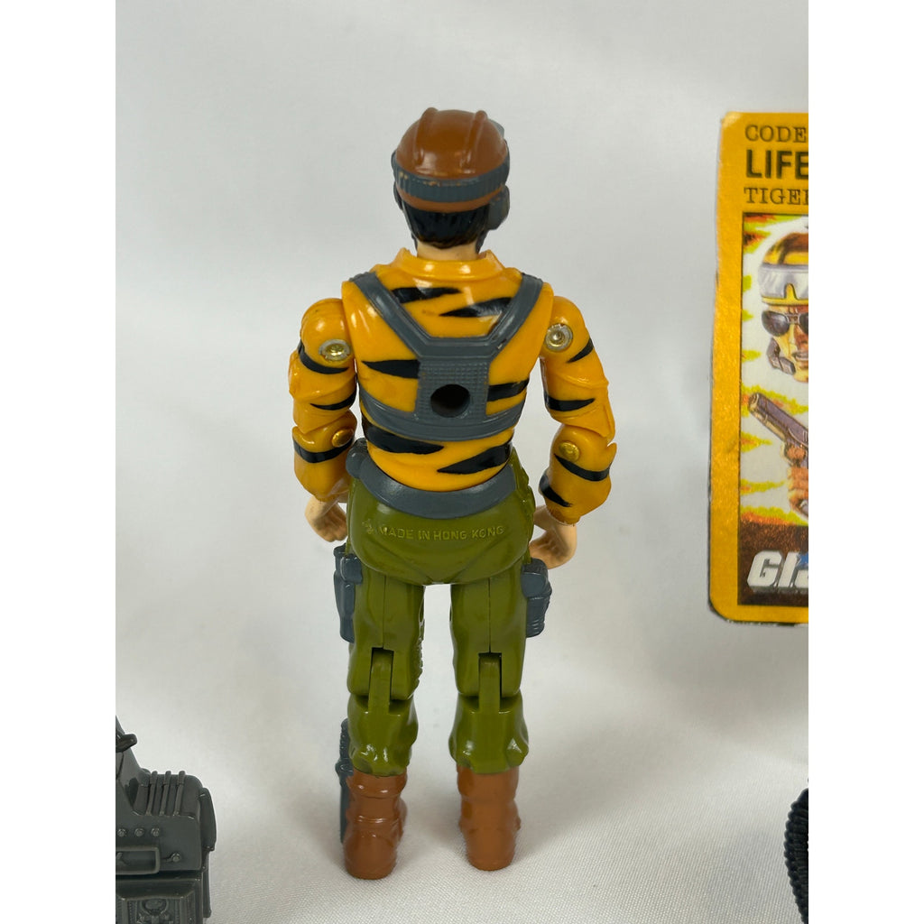 GI Joe Lifeline is a Tiger Force battlefield medic figure, known for his distinctive yellow and black uniform and rescue equipment. This example includes the original file card and accessories, making it a solid complete set for collectors.