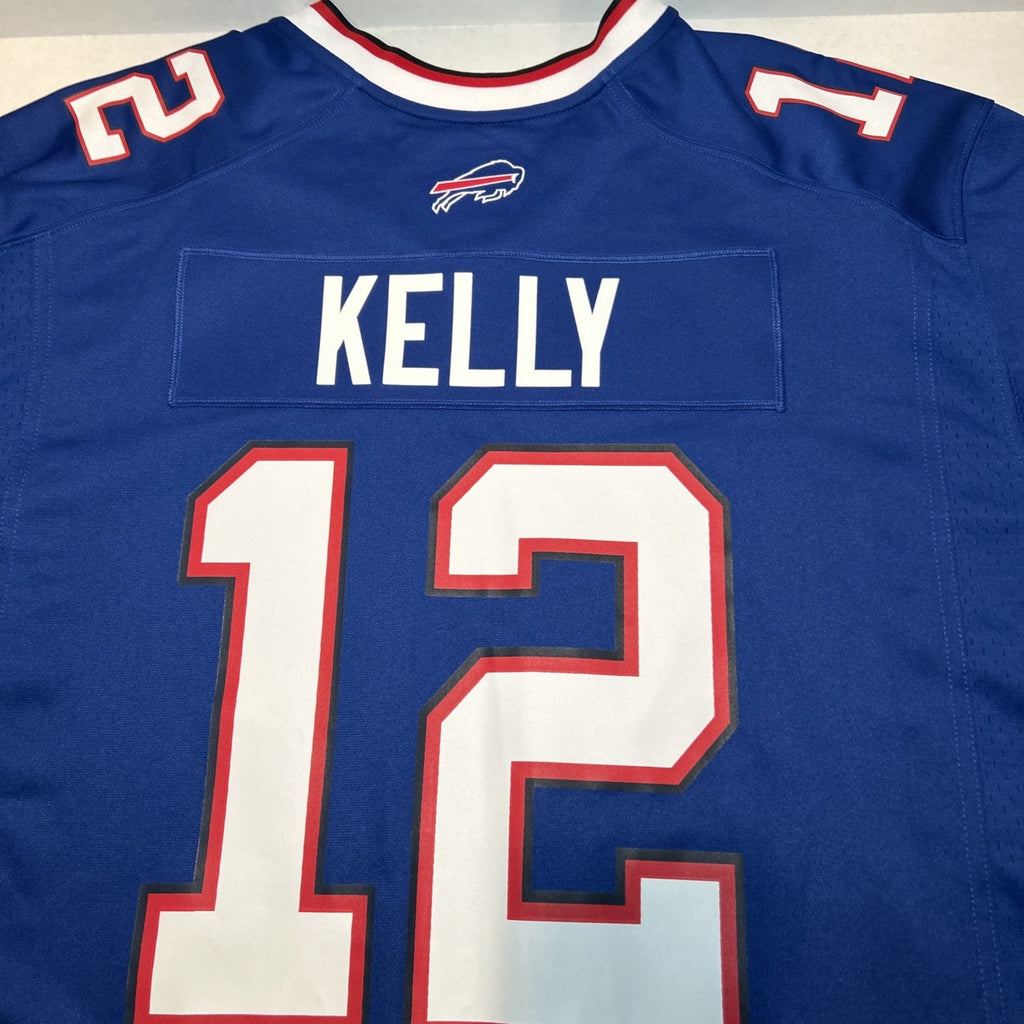 The product is a Nike Jim Kelley #12 Buffalo Bills NFL football jersey in size 3XL. It is officially licensed by the National Football League and specifically designed for male fans of the Buffalo Bills. This jersey is perfect for showing support for the team and player while watching or playing football. The high-quality material and construction make it a durable and comfortable addition to any football fan's wardrobe.