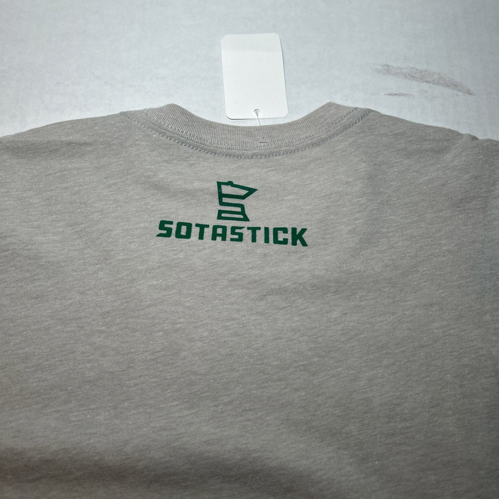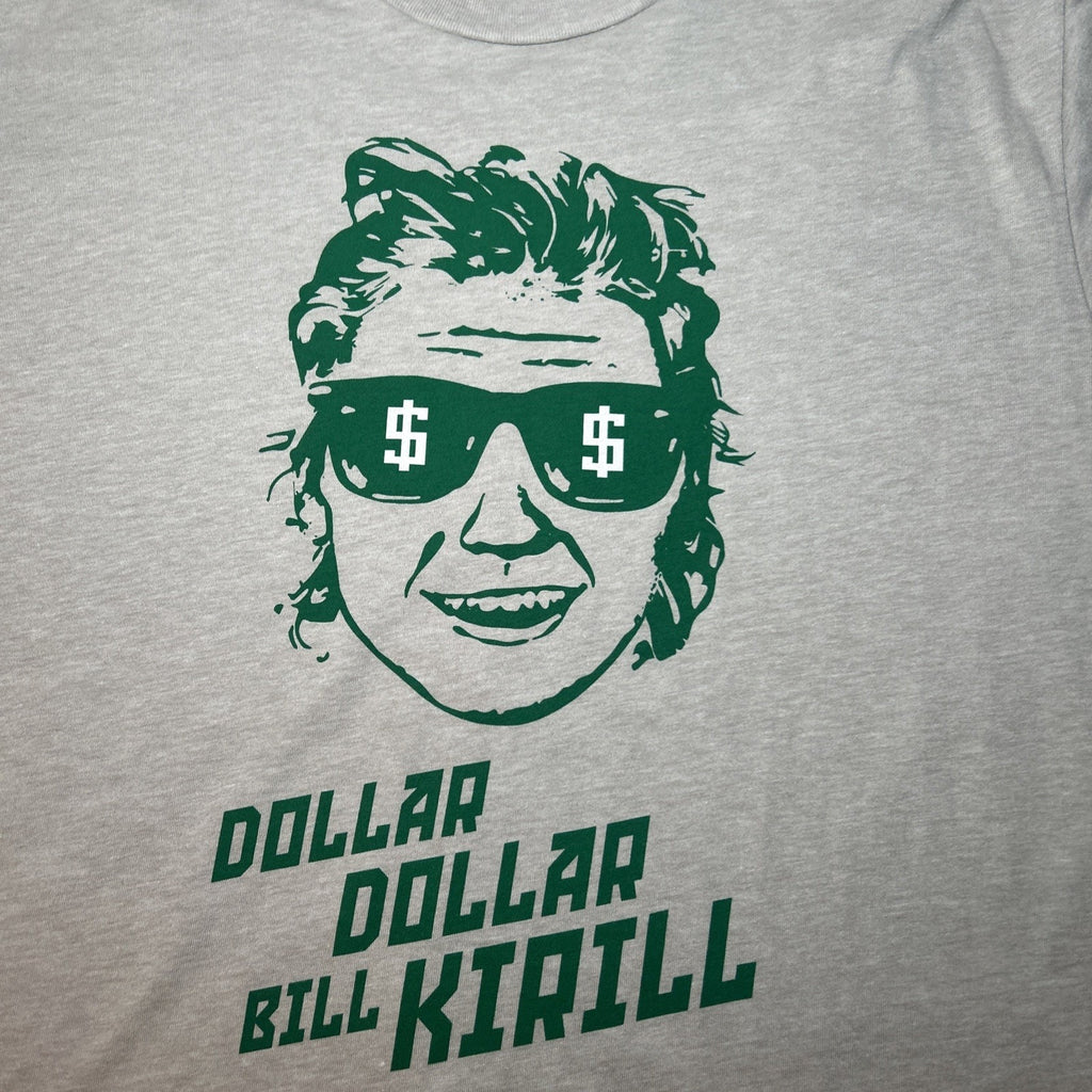 The product is a Sotastick brand T-shirt in size S. It features the Minnesota Wild star player "Dollar Dollar Bill Kirill" Kaprizov in a gray color. The shirt is sure to make a unique and funny statement with its unique design and large size. Perfect for those looking for a fun and quirky addition to their wardrobe.