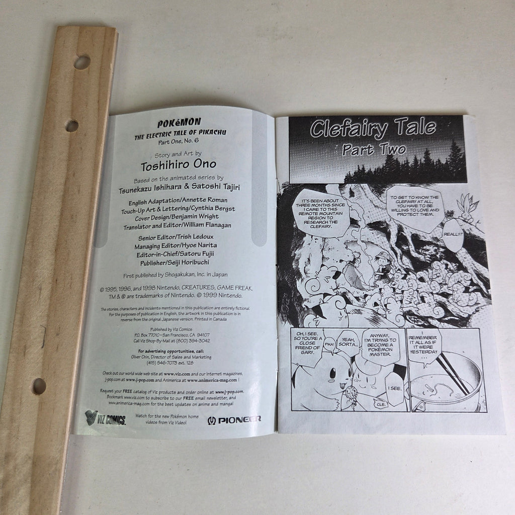Vintage Pokémon: The Electric Tale of Pikachu mini-comic, issue #6, published by VIZ Comics in 1999. This special edition comic was available exclusively with a Pokémon VHS tape and not sold separately in stores. Features story and art by Toshihiro Ono, based on the animated series by Tsunekazu Ishihara & Satoshi Tajiri. Compact mini size, approx. 5.5” x 8.5”. A nostalgic collectible for Pokémon and anime fans.