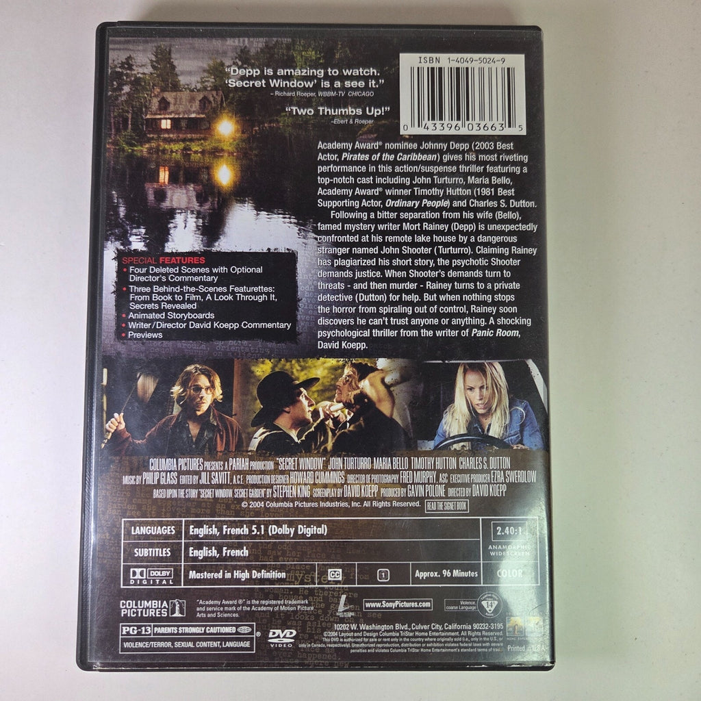 The Secret Window DVD from 2004 starring Johnny Depp is a mystery thriller directed by David Koepp. The movie follows a suspenseful storyline with a run time of 96 minutes, making it an engaging viewing experience. Produced by Gavin Polone and distributed by Sony Pictures, this English-language film is sure to captivate audiences with its intriguing plot and stellar performances, including a standout turn by Johnny Depp. Whether you're a fan of suspenseful movies or just enjoying a good mystery, this DVD is a must-have for any film collection.