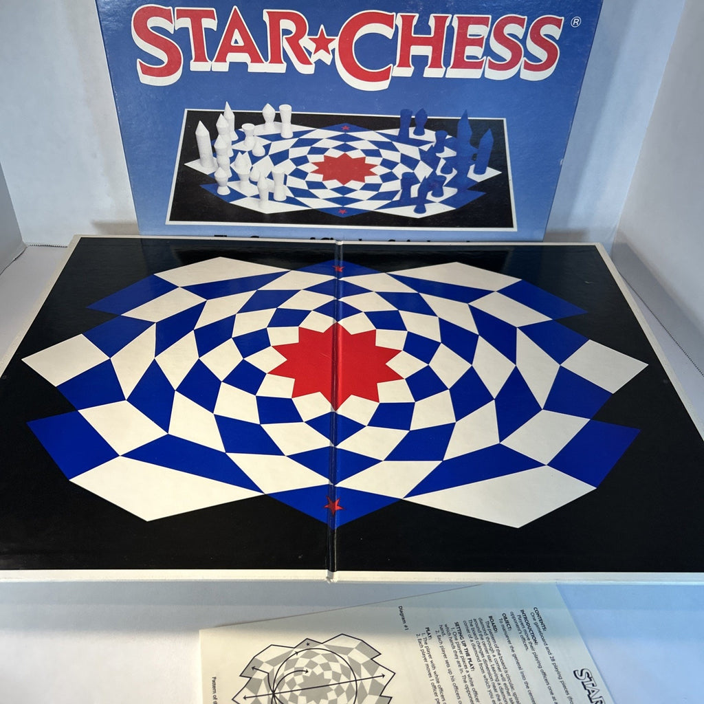 Star*Chess is a chess variant featuring a tessellated quadrilateral board surrounding a ten-pointed star. Players command a general, brigadier generals, colonels, majors, captains, and lieutenants, each with unique movements based on traditional chess pieces. Victory is achieved either by capturing your opponent’s general or moving your general to the center star.