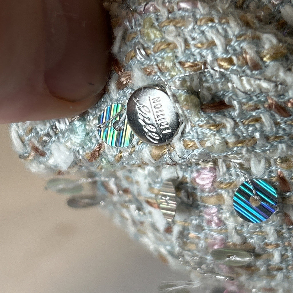 Cream-colored with pastel pink, mint, and silver woven tweed and sequins