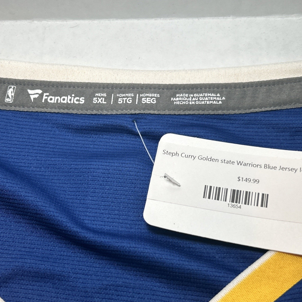 The product is a Stephen Curry #30 Golden State Warriors fan apparel, specifically a basketball jersey in size 5XL. It is officially licensed by the National Basketball Association (NBA) and produced by Fanatics. The jersey is in the team's official colors of blue and is designed for male fans of the Golden State Warriors. It is ideal for wearing during regular season games or as a casual fan accessory to show support for the team and player.