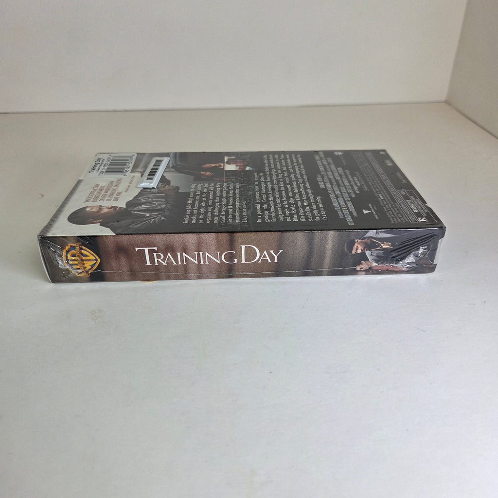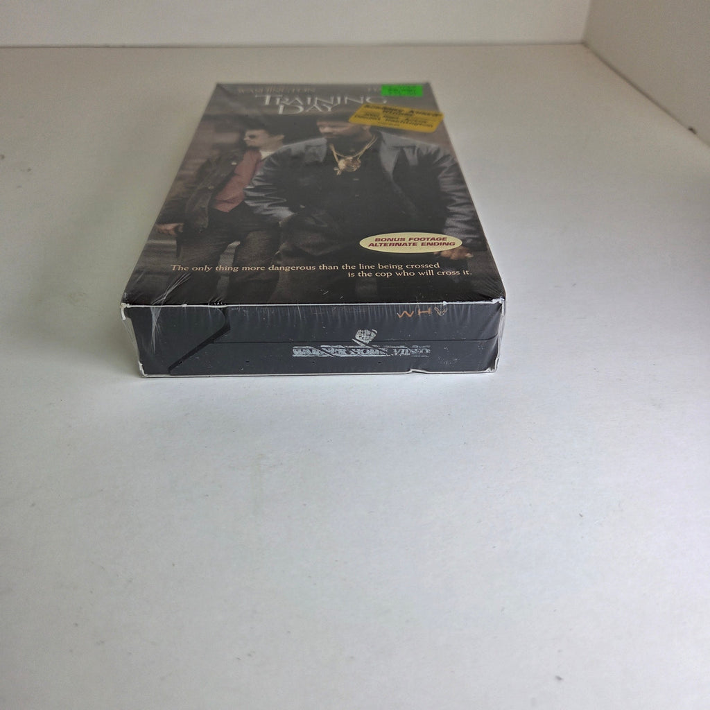 Factory-sealed Training Day VHS featuring Denzel Washington and Ethan Hawke. This version includes the "Bonus Footage / Alternate Ending" sticker on the shrink wrap. Released by Warner Home Video around 2002. Rated R, with a runtime of approximately 122 minutes.