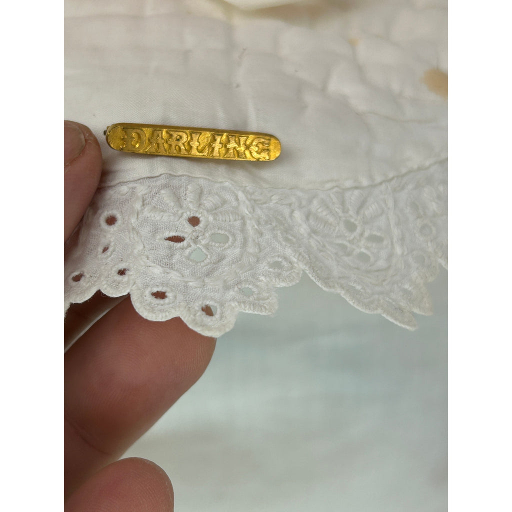 Costume: white cotton christening gown with extended train and eyelet trims, matching bonnet, bib/apron, slip and undergarments; small gilt “DARLING” pin on the bib. A group of old collector and repair tags accompanies the doll.