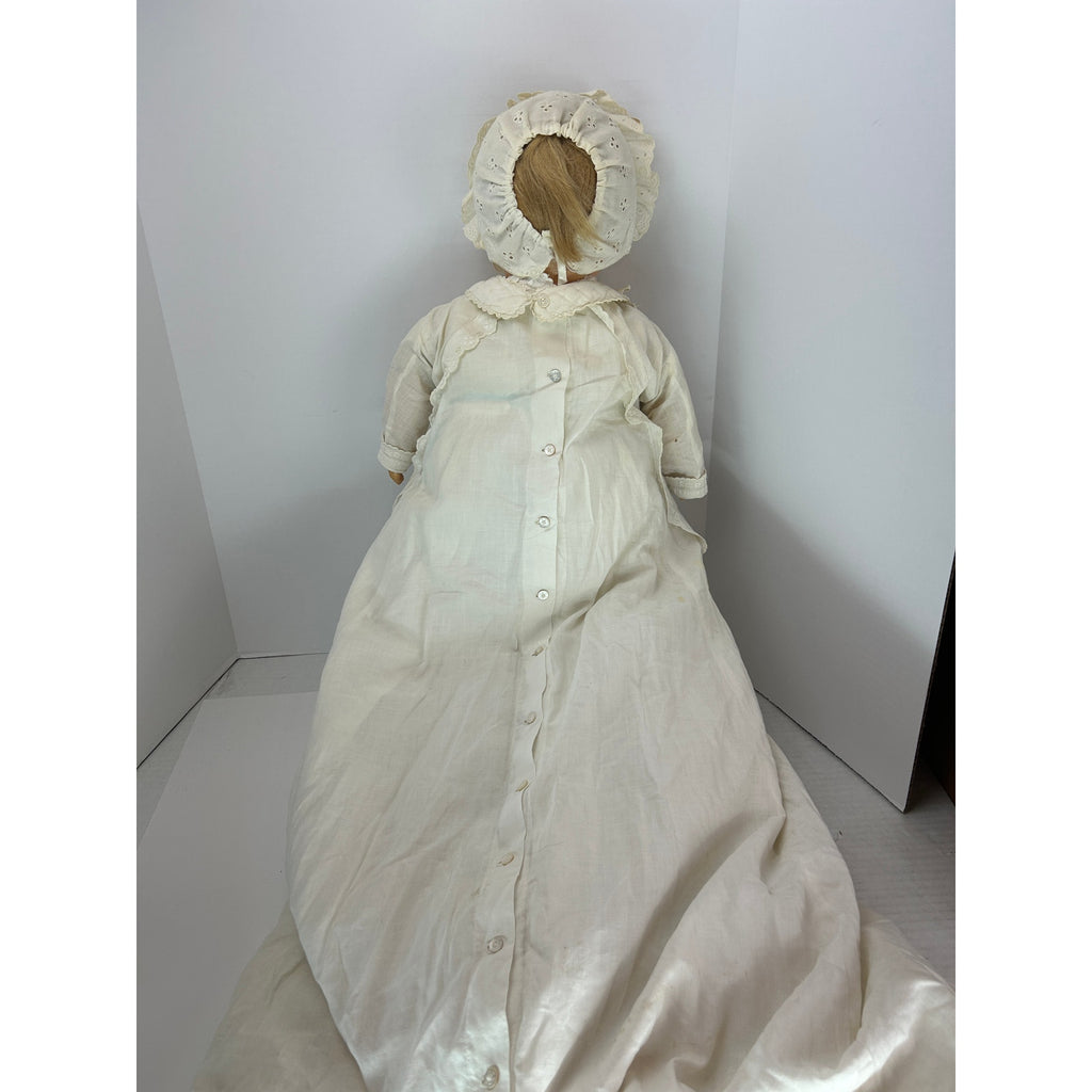 A large and charming antique composition baby, circa 1915–1925, wearing a beautiful long christening outfit. The unmarked shoulder-head has sleep glass eyes, feathered brows, open mouth with two teeth and a soft blond human-hair wig. Original/period cloth body with composition lower arms and lower legs/feet.