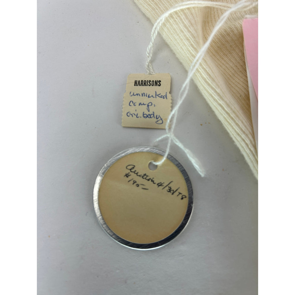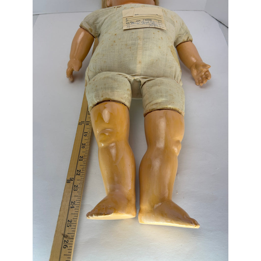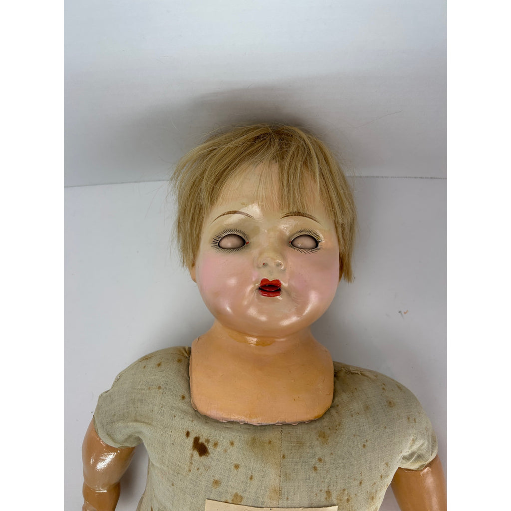 Condition: presents well, but with age and wear. Compo shoulder, head, and limbs show typical crazing, rubs and touch-ups; retouch visible at wig line and nape. Sleep eyes operate; one eye shows an old professional “fixed glass eye” repair per the tag. Cloth body is sturdy with scattered foxing. Clothing with age yellowing, scattered stains and small lace losses. Please review the photos as they form part of the description.