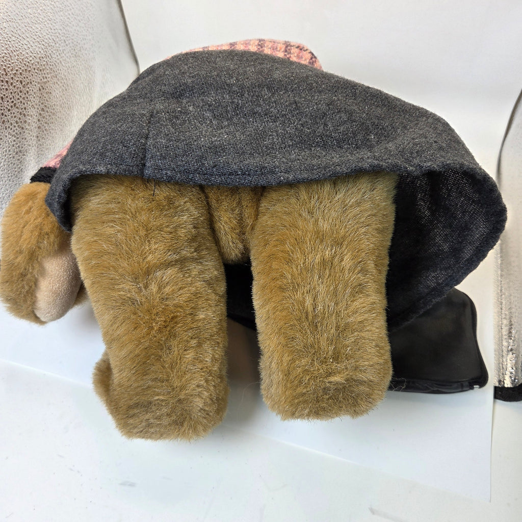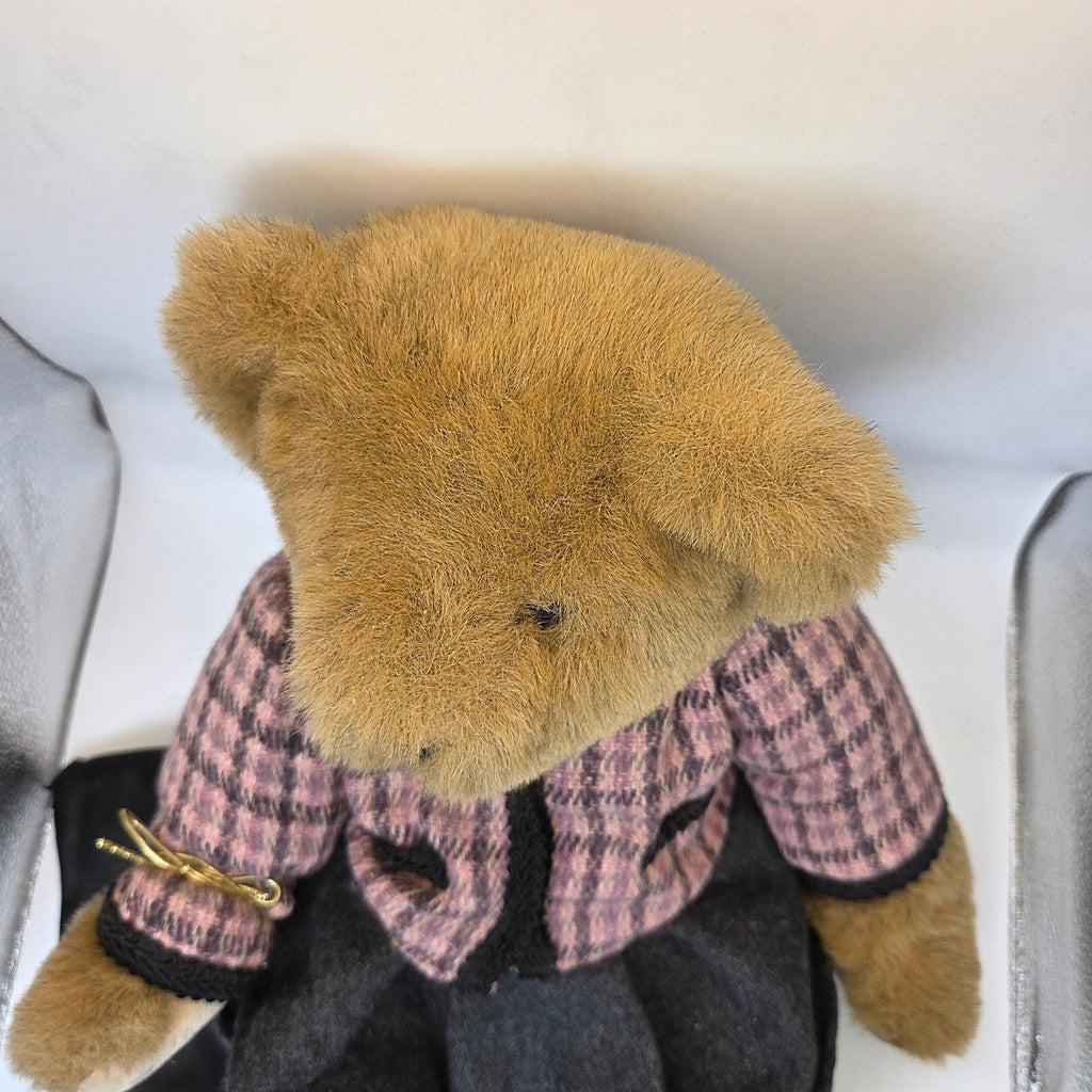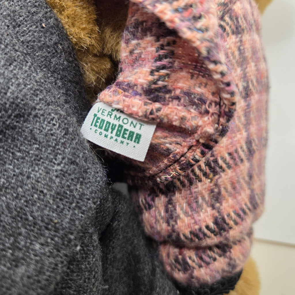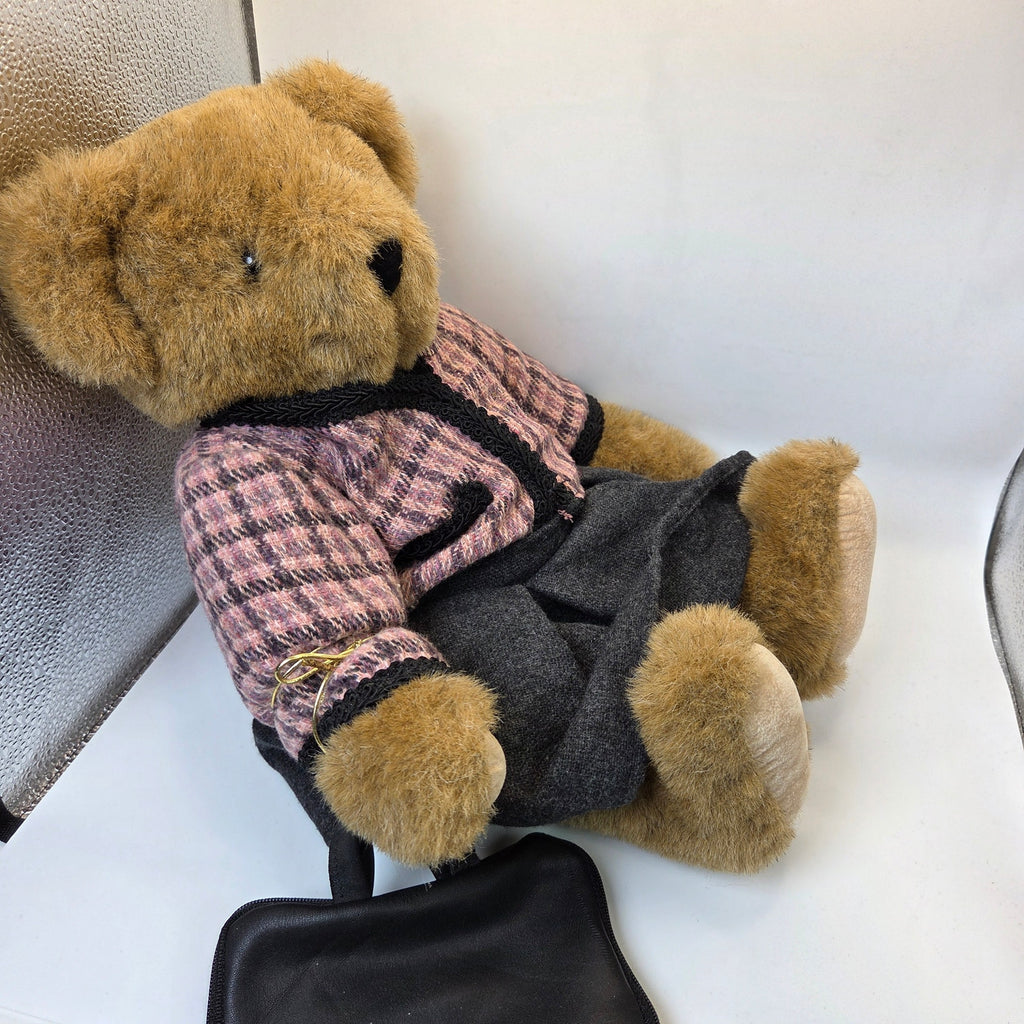This 1994 Vermont Teddy Bear Company jointed bear is dressed in a pink plaid tweed-style jacket with black trim, a charcoal skirt, and includes a matching black zippered purse accessory. The bear is fully jointed and measures approximately 11 inches seated (16–17 inches laying flat). Clothing pieces all have Vermont Teddy Bear Company tags. The bear appears to be in excellent condition with no noted rips, stains, or tears.