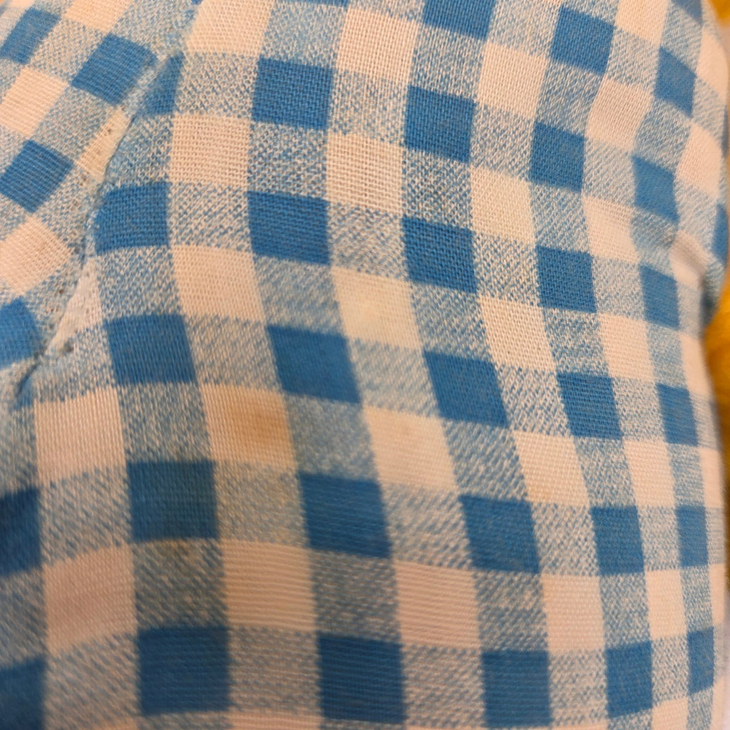 The plush shows normal age-related wear, including one small stain on the gingham fabric and light stitching separation typical for its age. A charming retro piece for collectors of vintage plush toys, farmhouse décor, or 80s childhood nostalgia.