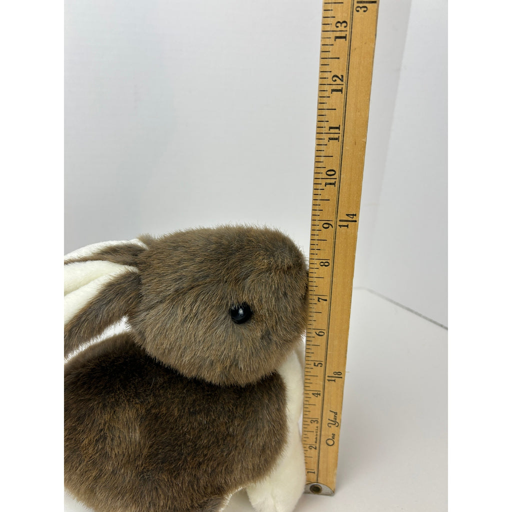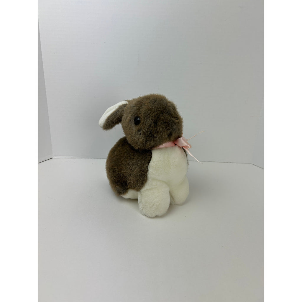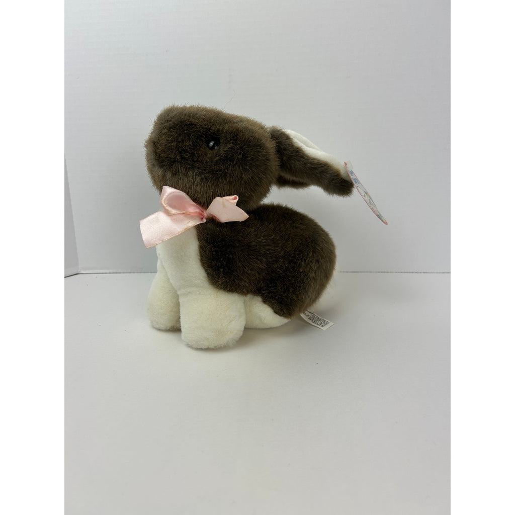 This plush Easter bunny features a classic brown and white rabbit design with floppy ears, a pink ribbon bow, and its original “Happy Easter” paper hang tag. Soft and well made, this bunny works as seasonal décor, a collectible plush, or a gift display piece.