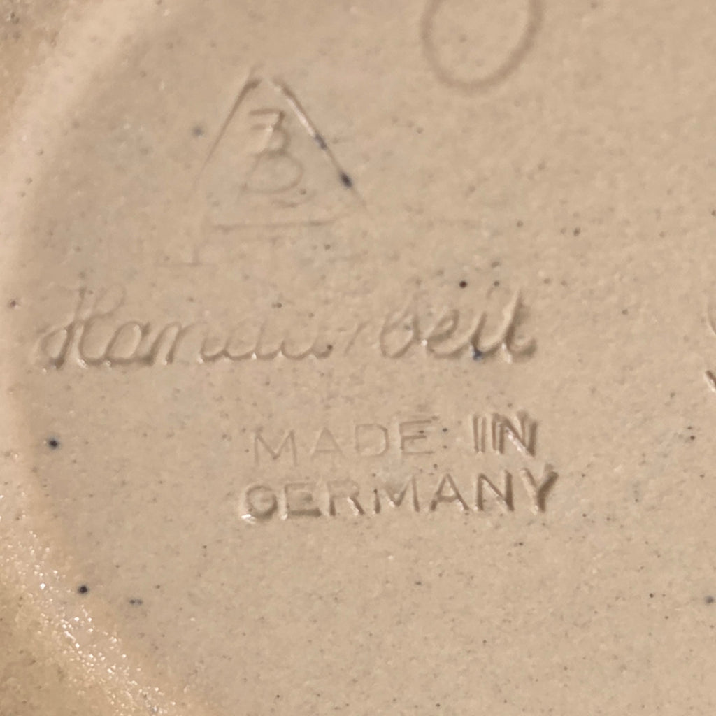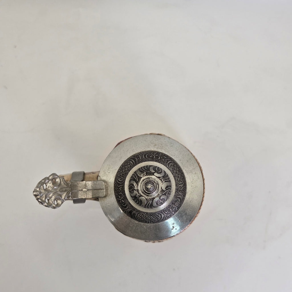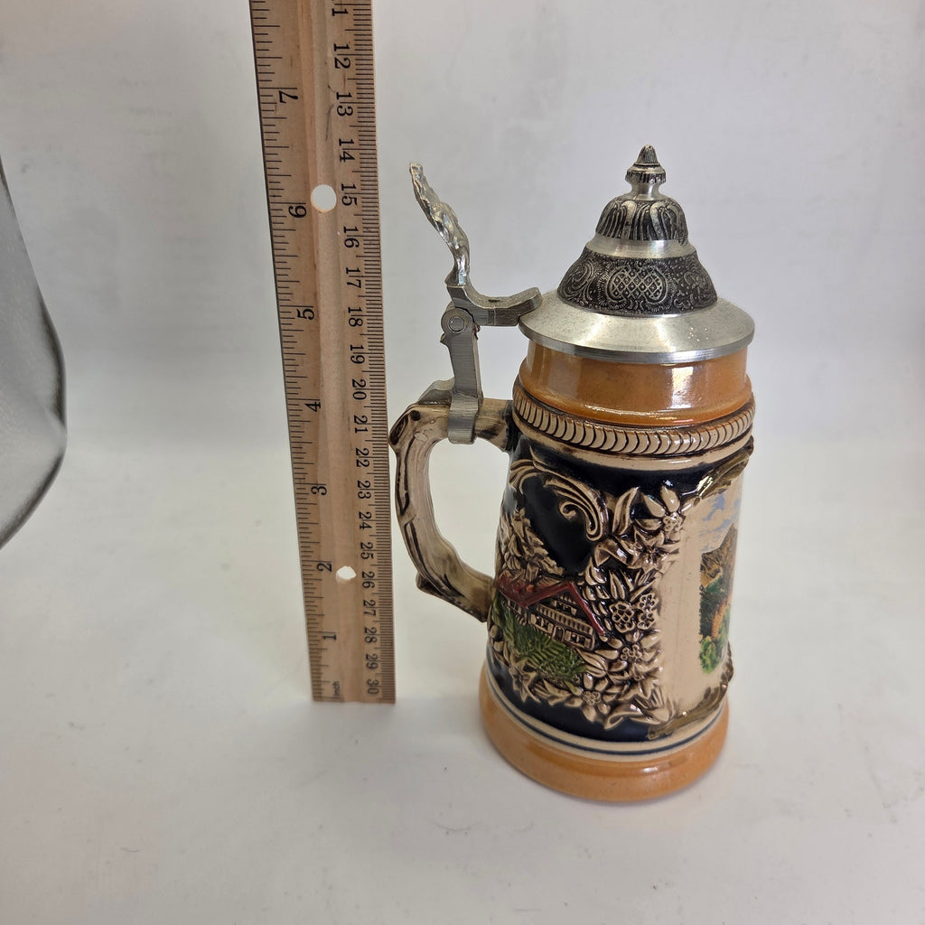 Vintage Handarbeit (handcrafted) German beer stein featuring a colorful raised-relief scene of Vaduz, Liechtenstein. Stoneware body with ornate handle and pewter hinged lid. Marked “Made in Germany” and “Handarbeit” on base with mold number 9. Beautiful traditional craftsmanship and a nice collectible size.