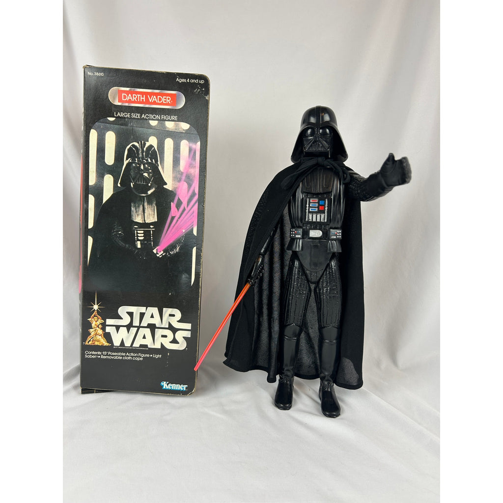 Original vintage Kenner Star Wars Darth Vader large-size action figure with original box. This is the classic 15 inch poseable figure from the original Star Wars era, featuring the removable cloth cape and red lightsaber.
