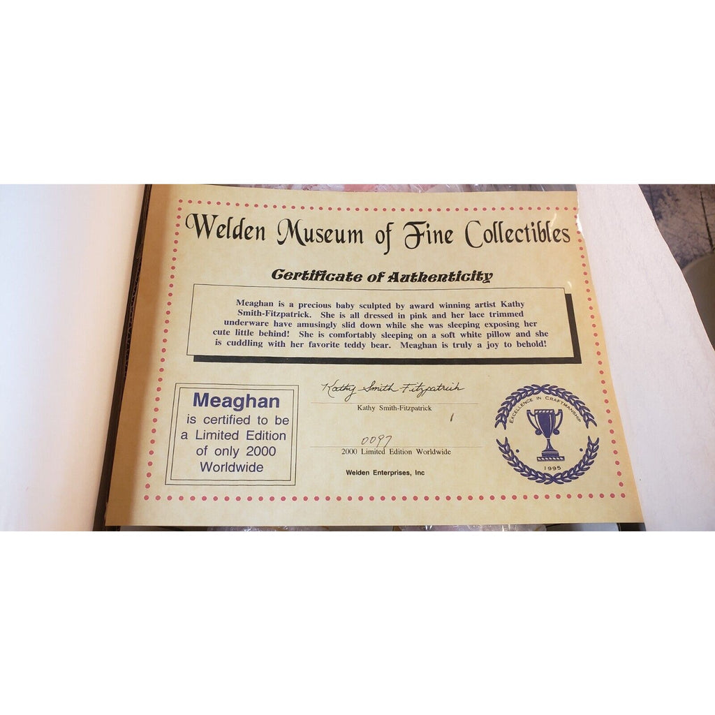 This rare 1995 Welden porcelain doll, “Meaghan” by Kathy Smith-Fitzpatrick, is a charming collector's item. Limited to just 2000 pieces worldwide, this is doll #97. She comes new in box, still wrapped, resting on a white pillow with her teddy bear companion—an adorable depiction of a sleeping baby in soft pinks.