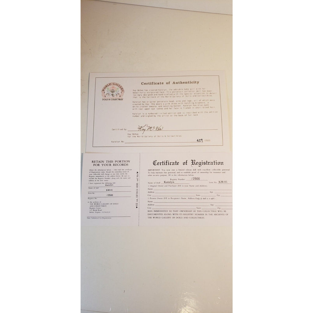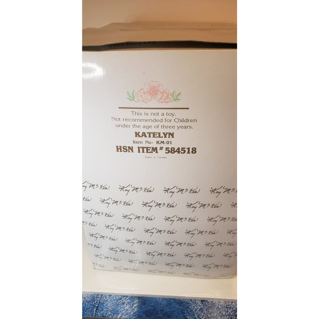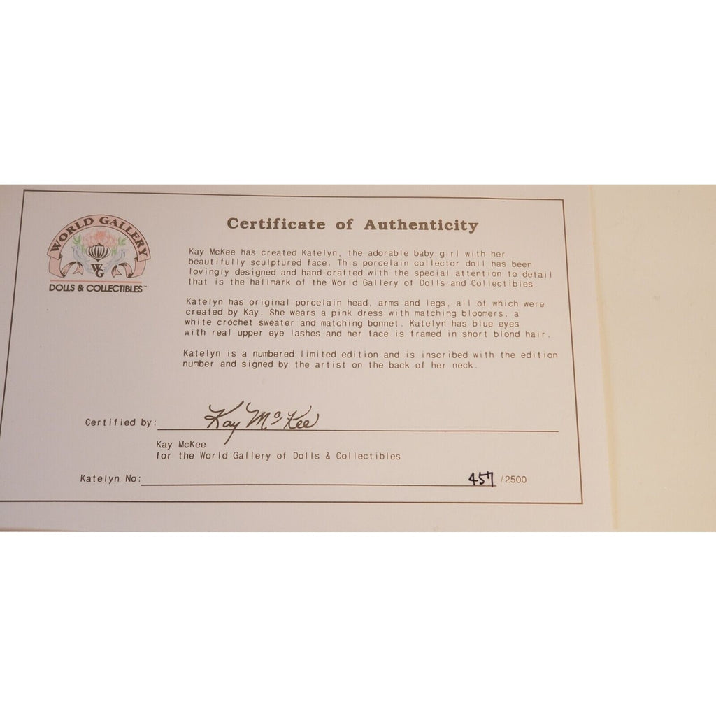 Meet “Katelyn,” a 23" porcelain doll by artist Kay McKee from the World Gallery collection. This limited edition doll (#457 of 2500) features a sweet expression with blue eyes, straight blonde hair, and a light complexion. She comes dressed in a detailed lace-trimmed outfit and bonnet, and includes her Certificate of Authenticity and original opened box (box has some storage wear). A lovely vintage addition to any serious doll collection.
