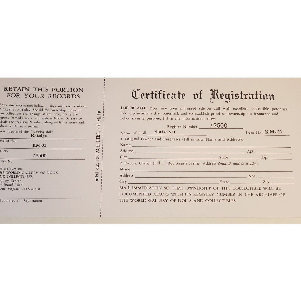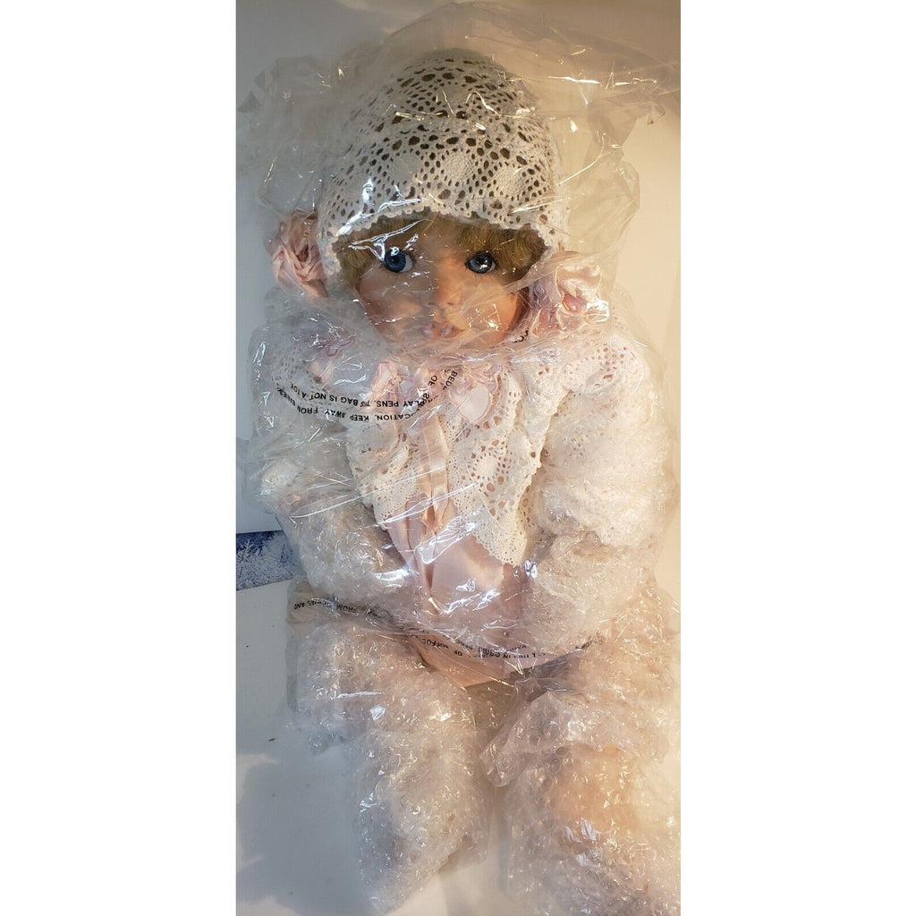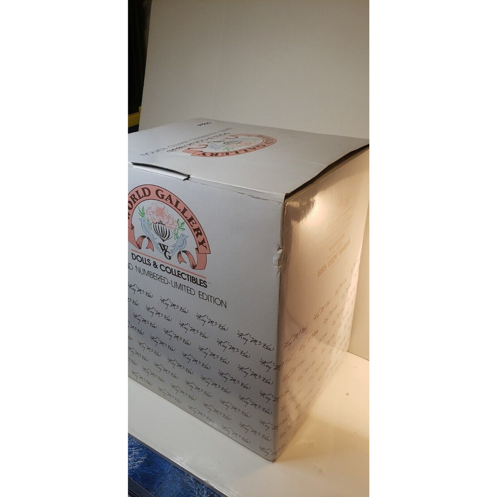 Meet “Katelyn,” a 23" porcelain doll by artist Kay McKee from the World Gallery collection. This limited edition doll (#457 of 2500) features a sweet expression with blue eyes, straight blonde hair, and a light complexion. She comes dressed in a detailed lace-trimmed outfit and bonnet, and includes her Certificate of Authenticity and original opened box (box has some storage wear). A lovely vintage addition to any serious doll collection.