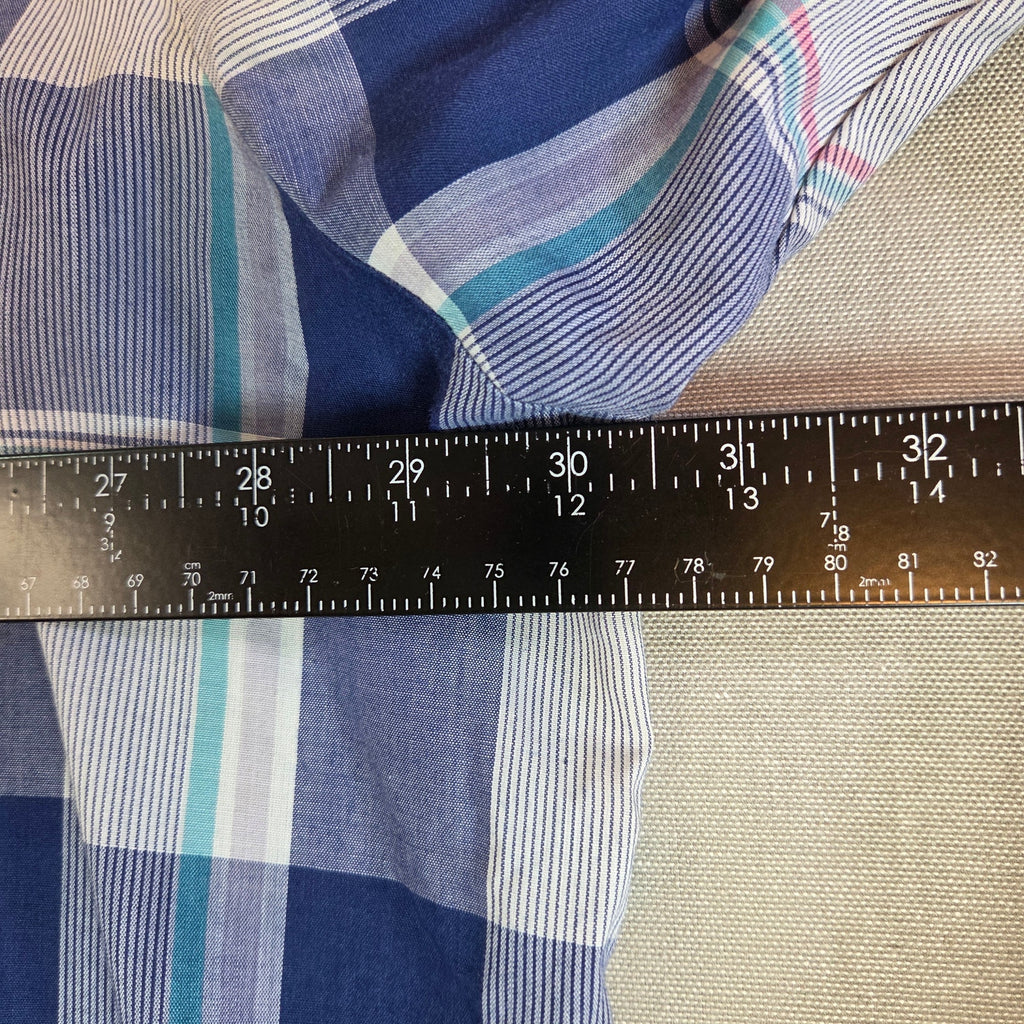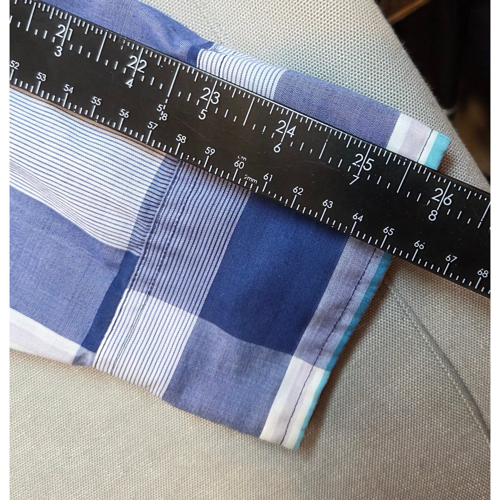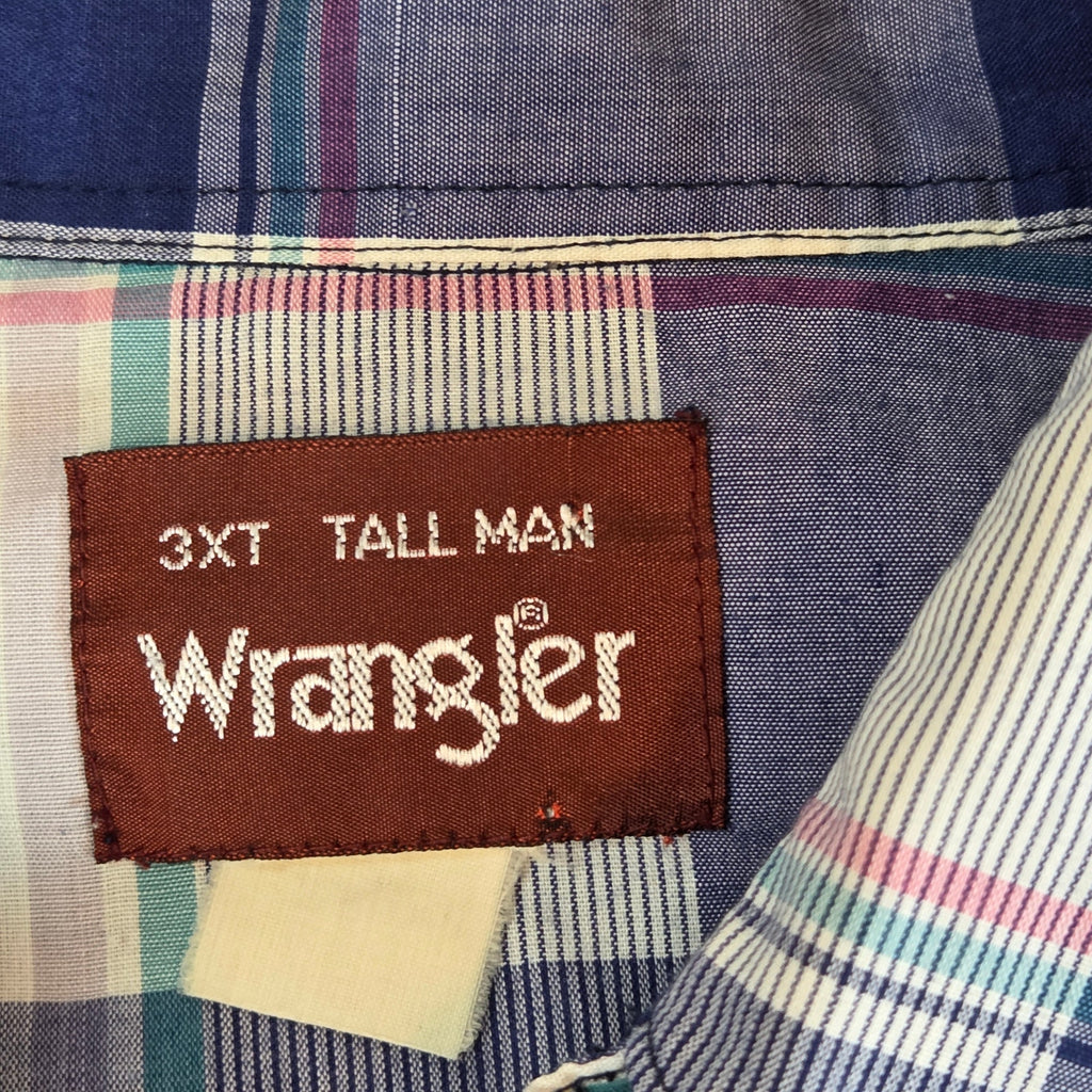Wrangler Tall Man 3XT western pearl snap shirt in a blue plaid pattern with dual chest pockets and western yoke design. Extended tall fit for extra sleeve and torso length. Small holes on both sleeves and a faint stain inside one cuff (see photos).