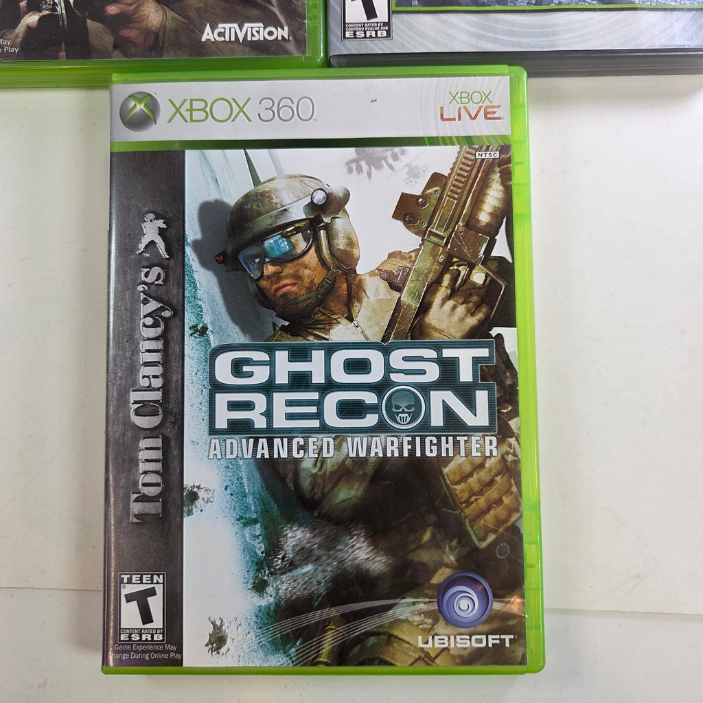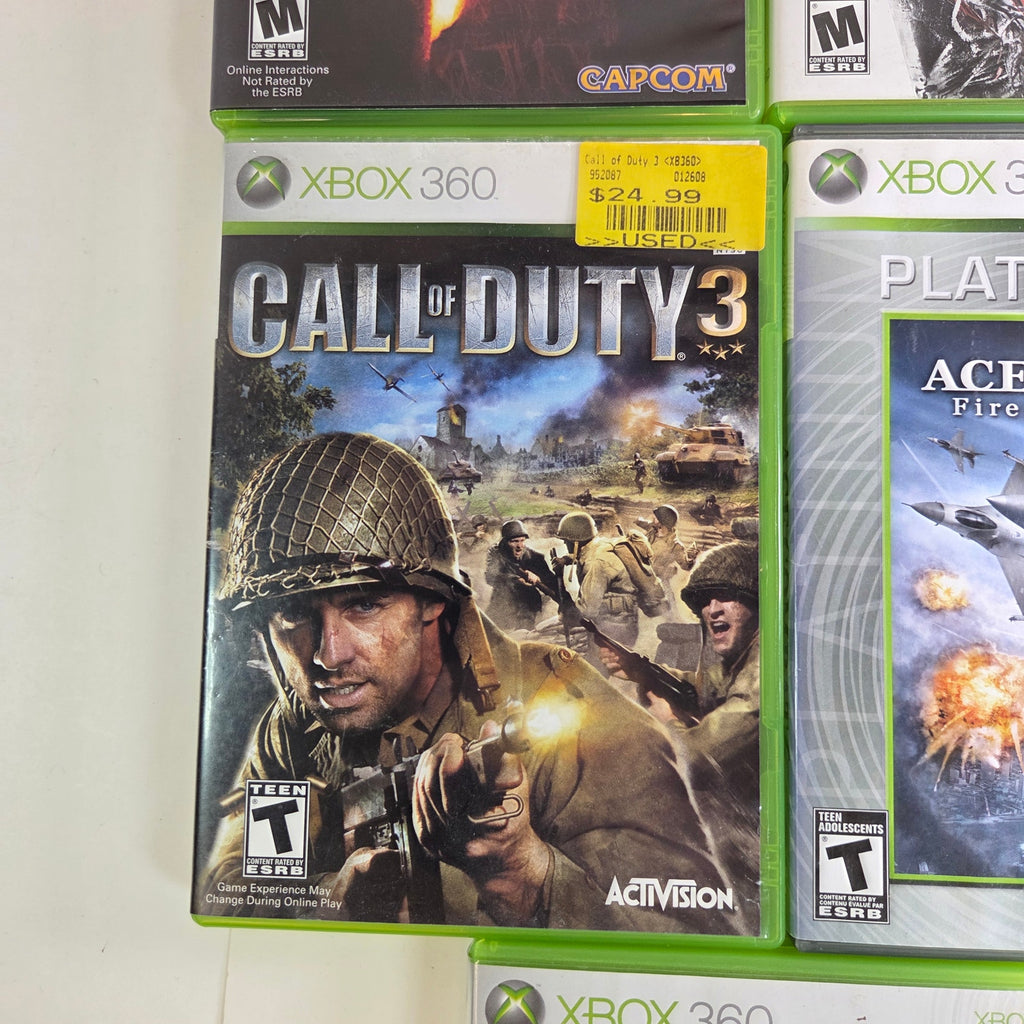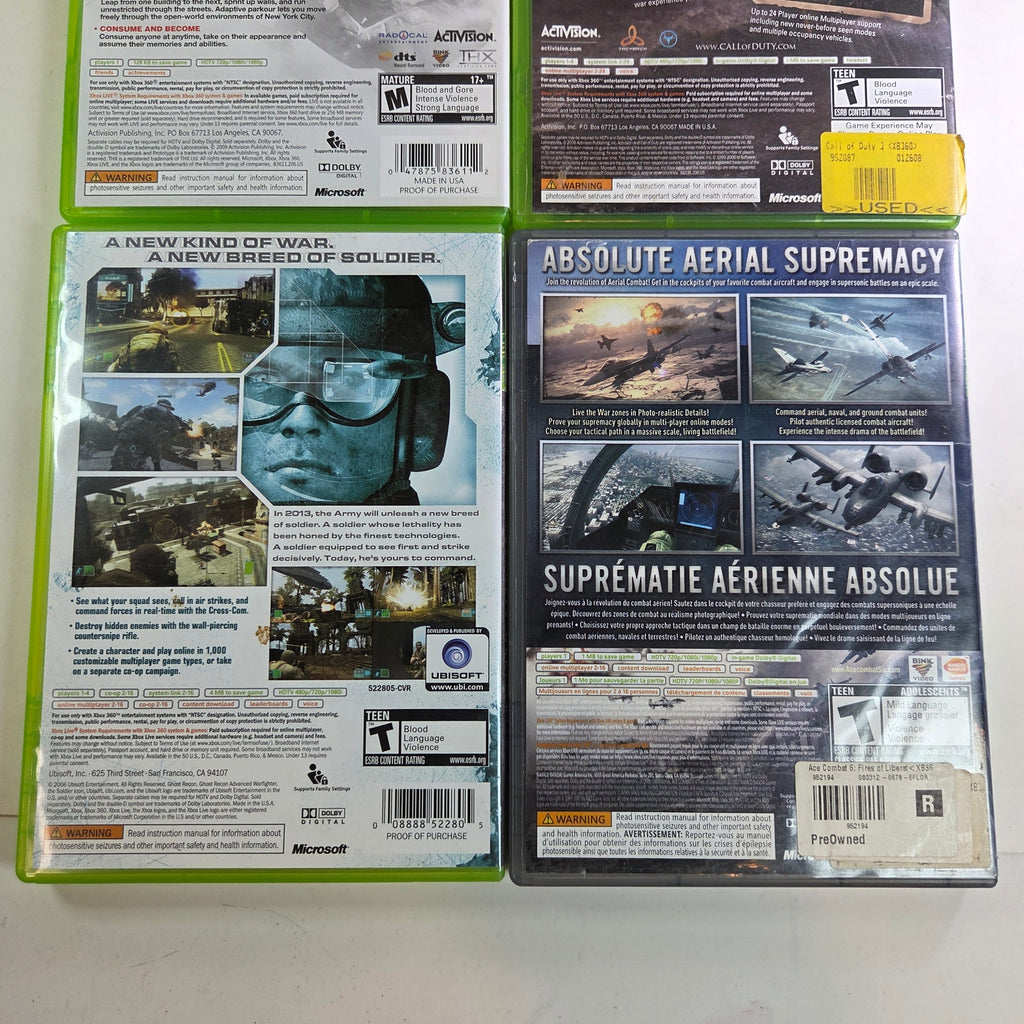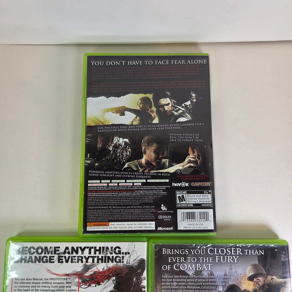Lot of five Xbox 360 games featuring a mix of action, shooting, and adventure titles. Includes Resident Evil 5, Prototype, Call of Duty 3, Ace Combat 6: Fires of Liberation (Platinum Hits), and Tom Clancy’s Ghost Recon: Advanced Warfighter.
